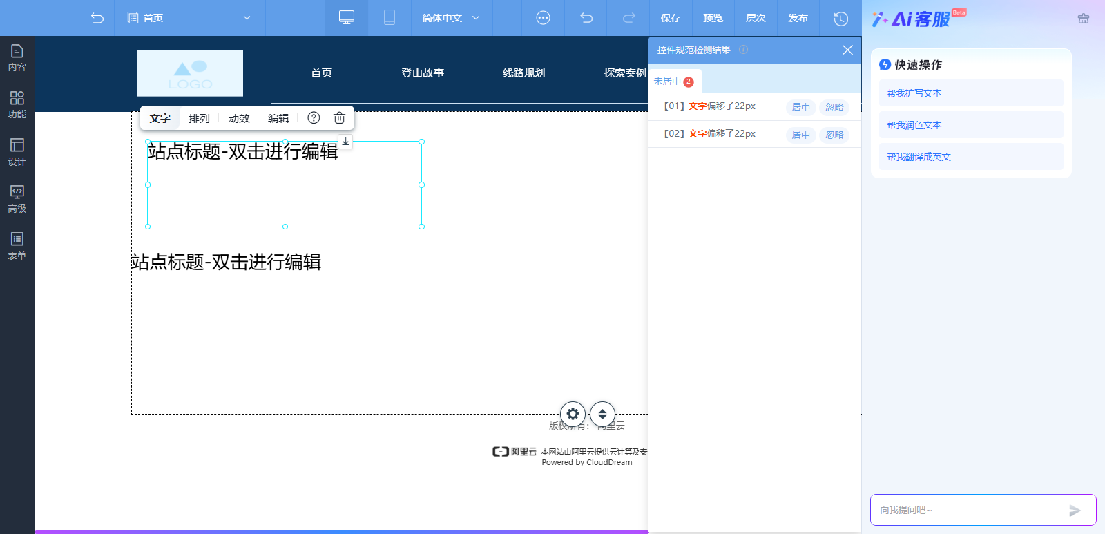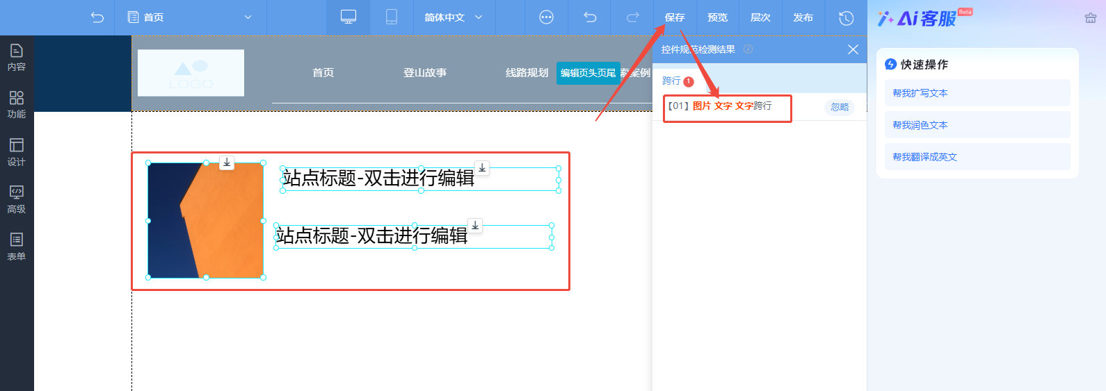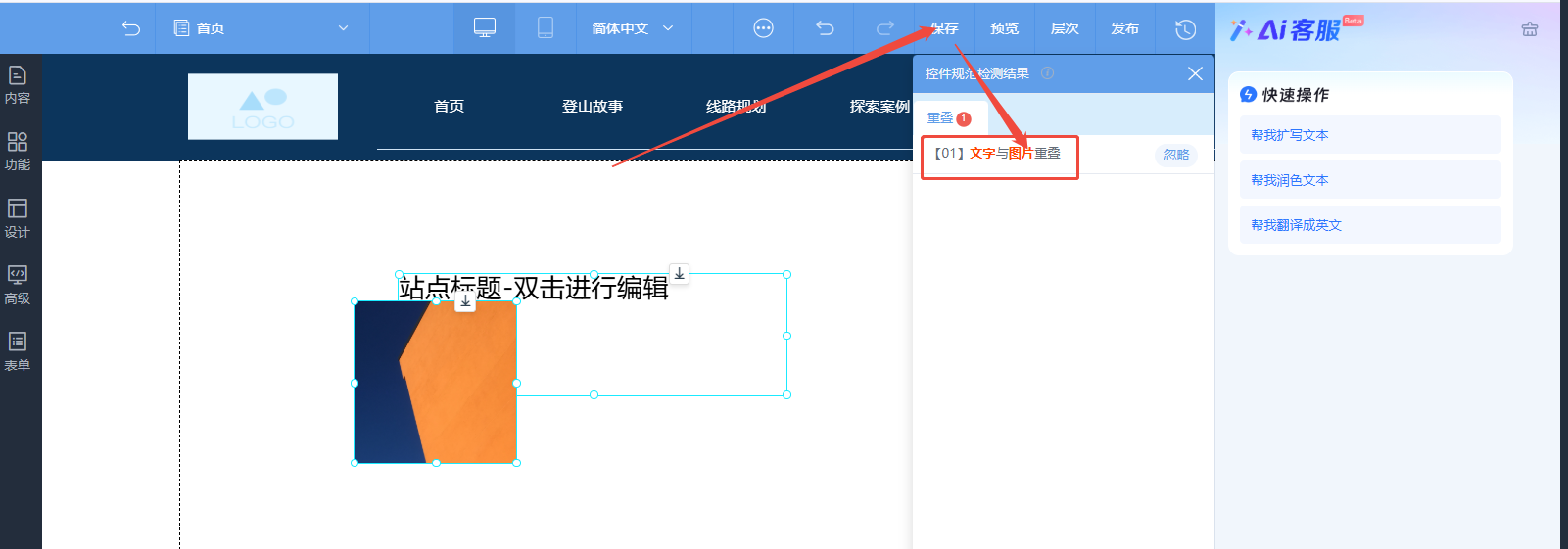 单击重叠问题后会直接定位到该控件所在位置。可明显查看到按钮控件与文字控件有重叠部分