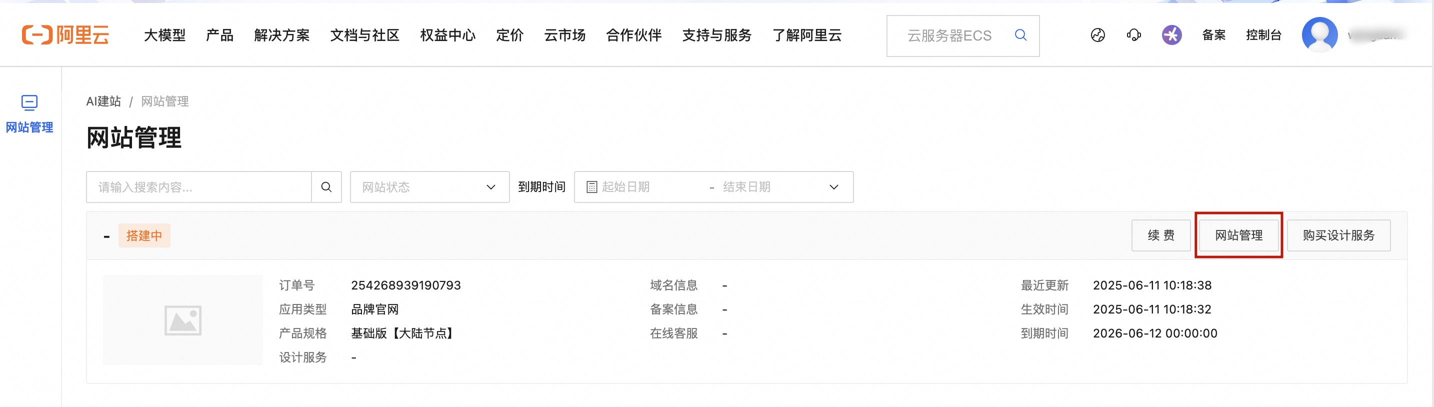 三、若您无法通过上述方式进入网站后台,请您点击该链接(wanwang.aliyun.com)登录购买网站的阿里云账号点击【建站控制台--网站管理 】