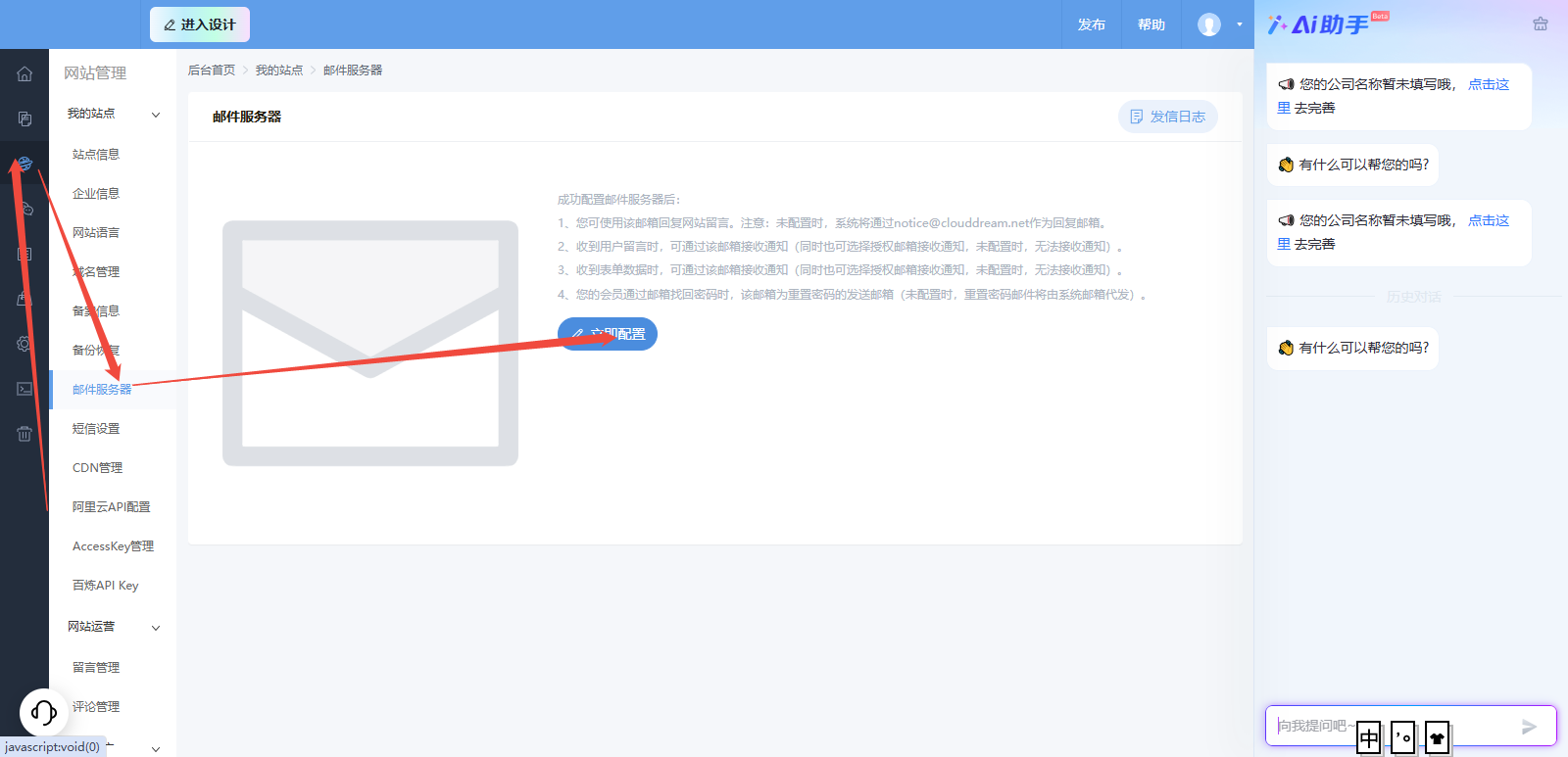 确认配置后到留言管理,配置邮件提醒