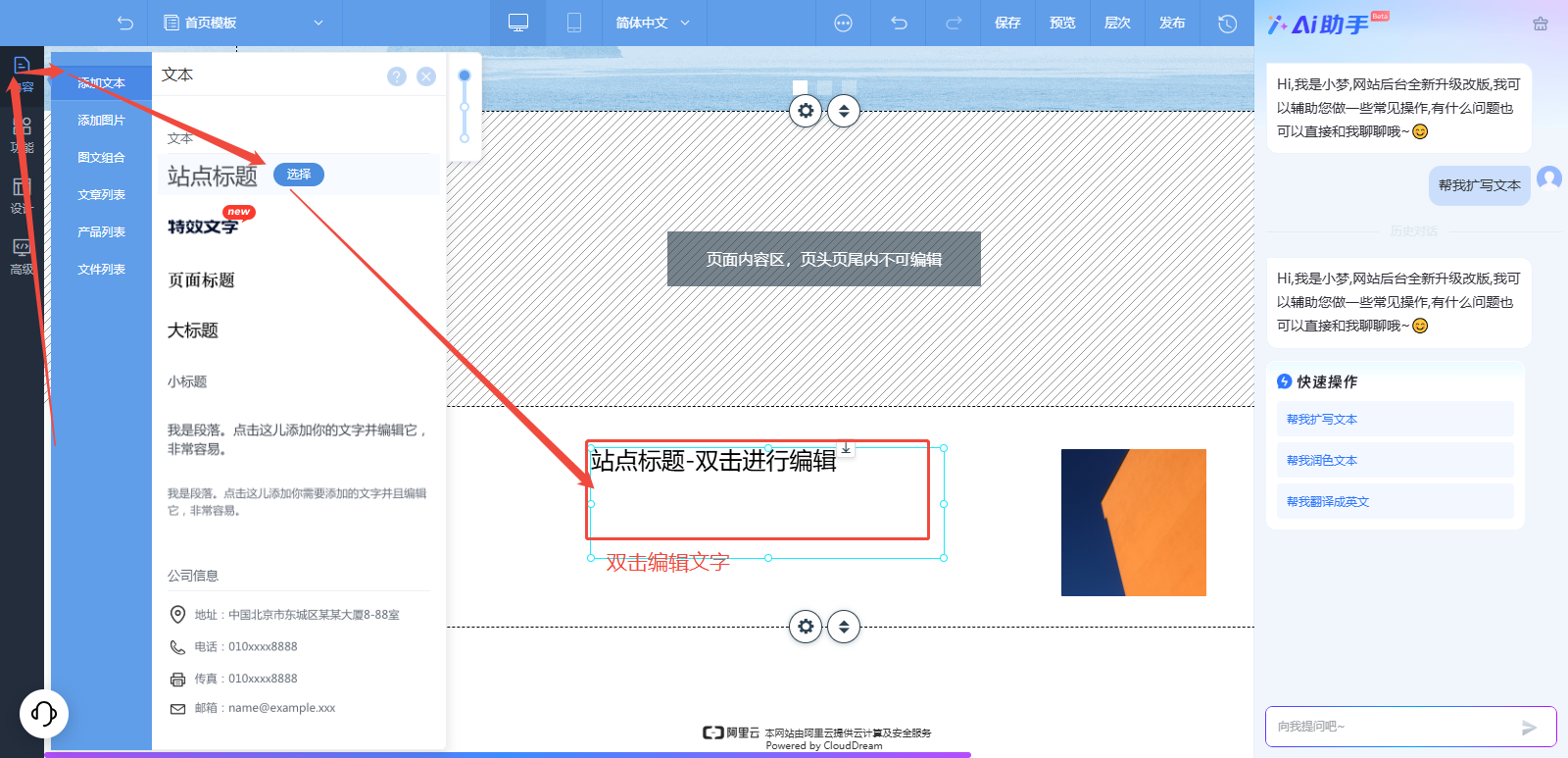 可以在设计页面点击左上角页面管理-页头页尾-点击对应页头页尾进入编辑页,点击左侧内容-添加文本进行添加,字体选择思源黑体。
