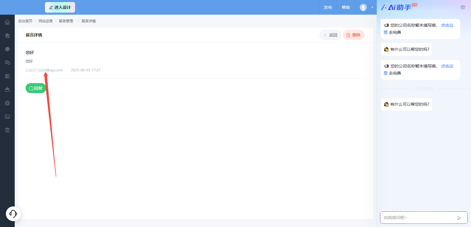 在网站后台进行回复留言,对方可以通过留言的邮箱接收到回复的信息