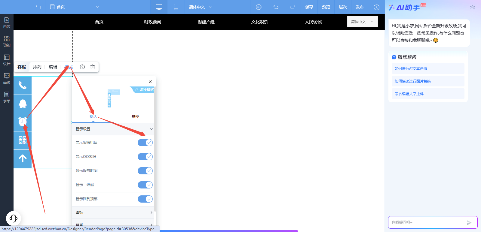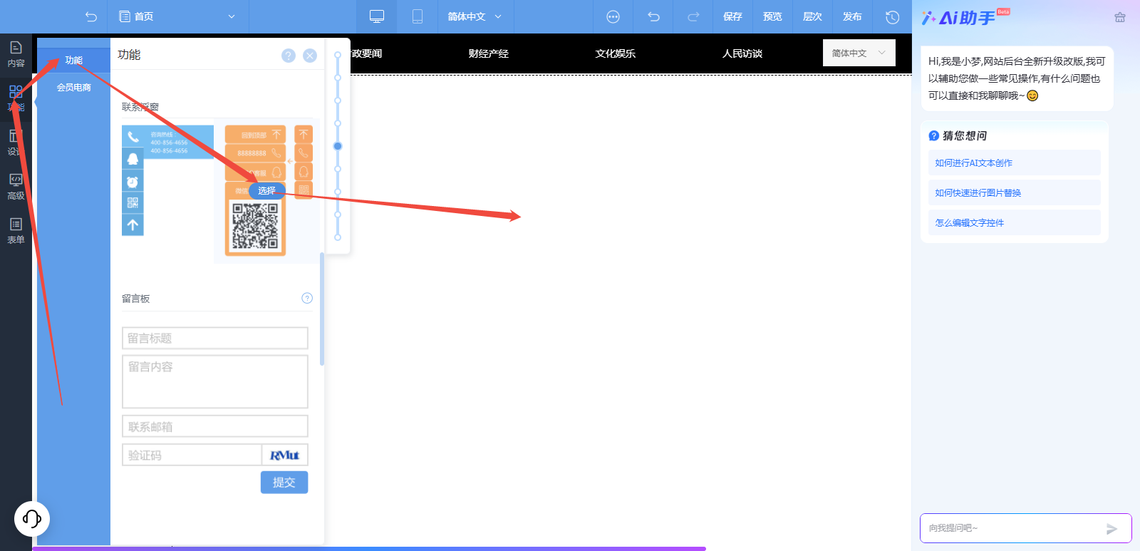 进入设计页面点击左边的功能--功能--联系浮窗--选择--点击页面空白位置进行添加