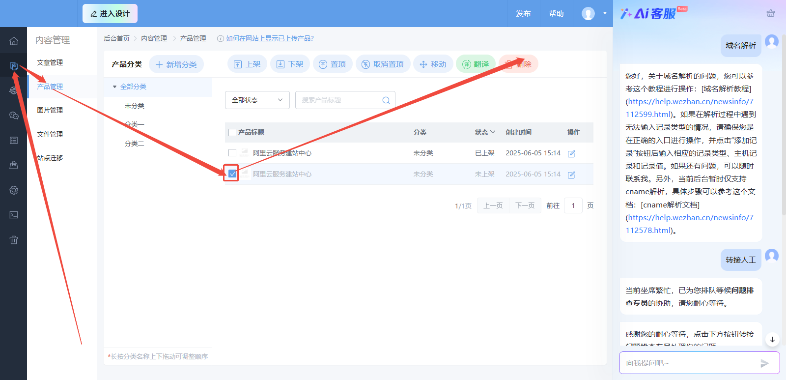 进入网站后台--内容管理--产品管理--勾选需要删除的产品进行删除